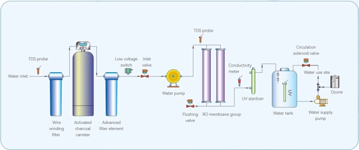 At the core of the system is a single-stage Reverse Osmosis (RO) process, which effectively removes dissolved solids, organic matter, heavy metals, and other impurities from the incoming water. The RO membrane acts as a molecular barrier, ensuring that only pure water molecules pass through while contaminants are flushed away. This process guarantees stable and reliable water quality suitable for medical applications where precision and safety are essential.