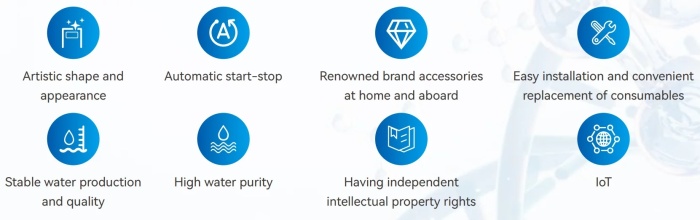The system's automation and control features further enhance its performance and user convenience. Equipped with intelligent sensors and microprocessor control, it supports automatic start and stop based on water demand and storage tank levels. The built-in conductivity meter continuously monitors water quality, giving users real-time assurance of system performance. In addition, IoT (Internet of Things) functionality allows for remote monitoring, fault alerts, and performance diagnostics, providing maintenance teams with early warnings and minimizing downtime.